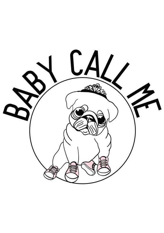 这款服装印花设计以一只戴着皇冠的哈巴狗为中心,搭配’BABY CALL ME’字样,展现出可爱和时尚的风格。适用于各种休闲服装裁片,如T恤、卫衣等,适合日常穿着和宠物爱好者。