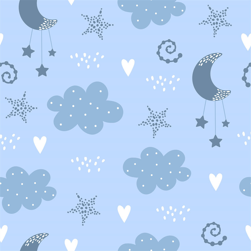 这款梦幻蓝色夜空面料印花设计,以柔和的蓝色为底色,搭配月亮、星星、云朵和心形等元素,营造出宁静而温馨的夜空氛围。适用于儿童服装印花,如连衣裙、连体衣等,为孩子们带来甜美的梦境体验。