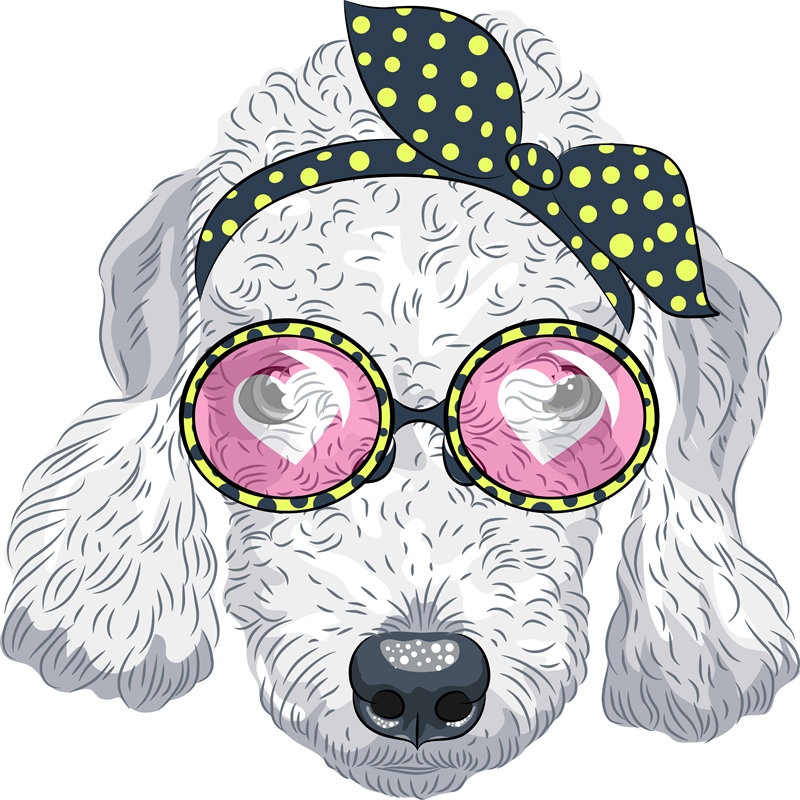 这款设计以一只戴着圆框眼镜和波点头带的卡通狗狗为主题,展现了活泼可爱的风格。适用于儿童服装印花或宠物服饰设计,增添趣味和个性。