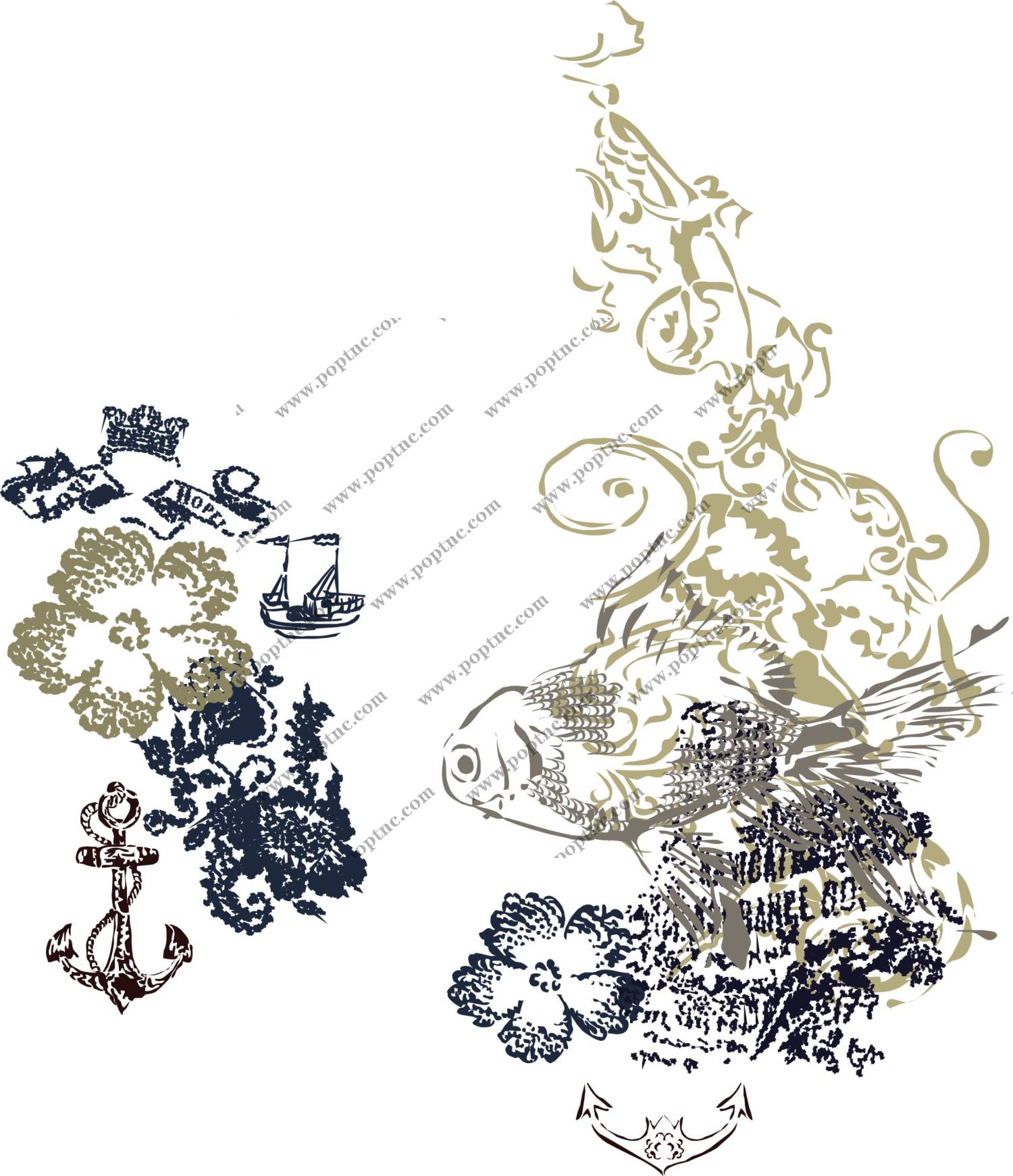 POP花型网 » 植物花卉金鱼矢量图裁片烫图花型