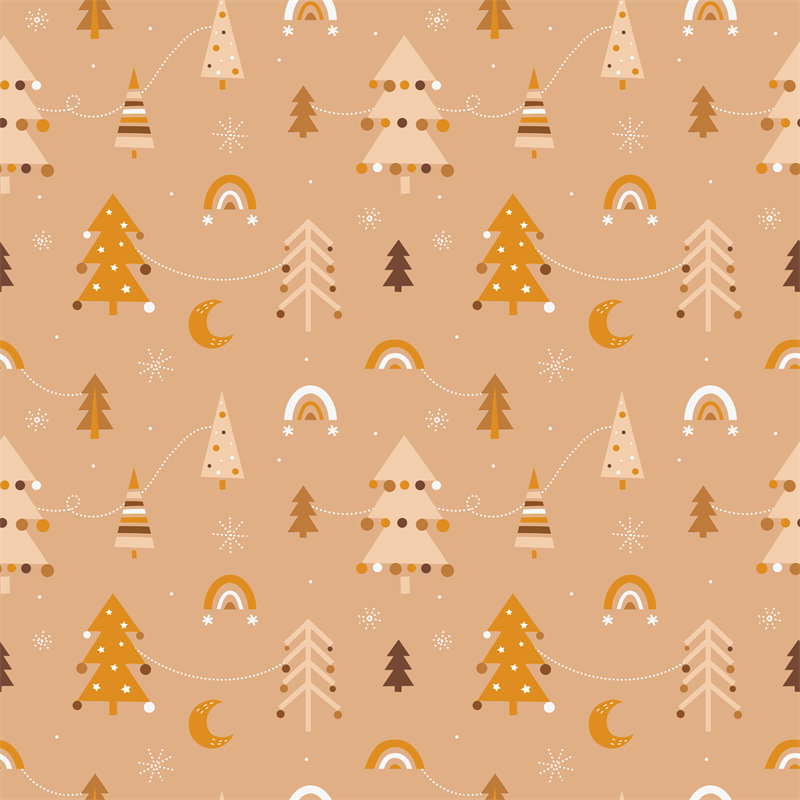 这款面料印花以圣诞树和月亮为主题,采用温暖的棕色和橙色调,营造出温馨的节日氛围。适合用于制作冬季服装,如毛衣、围巾和帽子,增添节日气息。