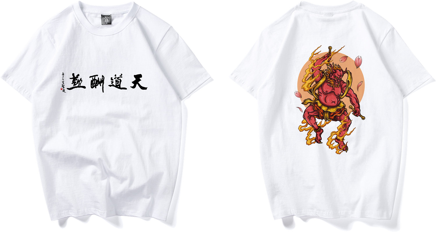 这款T恤采用高质量的裁片印花技术,正面印有传统的中国神话人物图案,背面则是富有深意的中文书法。设计独特,色彩鲜艳,适合追求个性化和文化特色的时尚爱好者。无论是日常穿着还是特殊场合,这款服装印花T恤都能展现出独特的个人风格。