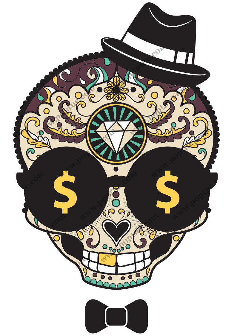 POP花型网 » 几何花纹拼接骷髅头钱币符号领结服装T恤烫图印花花型素材