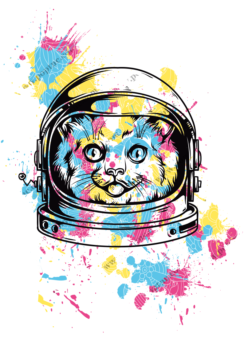 POP花型网 » 猫咪太空服多彩涂鸦图案服装T恤裁片烫图印花花型素材