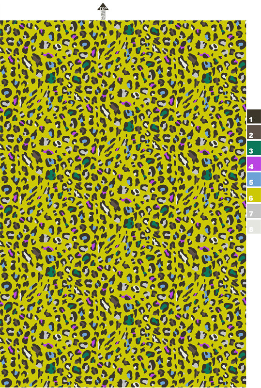 这款金昌印花花型采用多彩豹纹设计,以黄色为底色,搭配黑色、紫色、绿色等斑点,展现出独特的时尚感。适用于各种服装印花,如连衣裙、上衣和配饰,为日常穿着增添一抹亮丽。