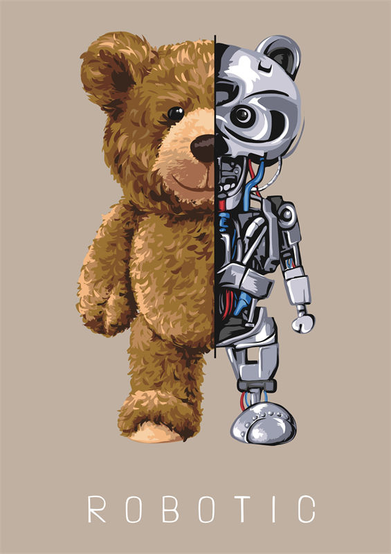 创意机器人裁片印花服装印花设计,未来科技感与经典毛绒熊的完美结合