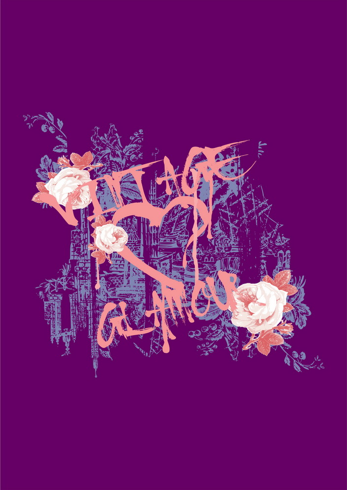 POP花型网 » 紫色背景上的花卉与抽象艺术裁片印花服装