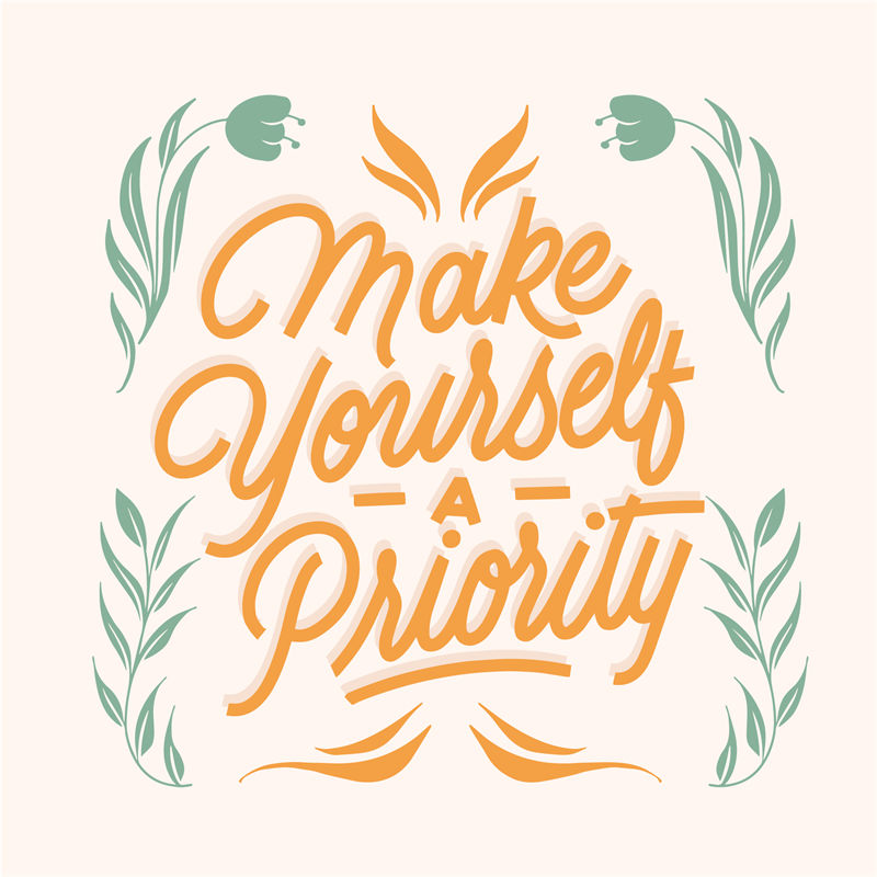 这款温馨自然风裁片印花服装,以柔和的橙色和绿色为主调,搭配鼓舞人心的’Make Yourself A Priority’字样,适合日常休闲穿着,传递自我关爱的生活态度。