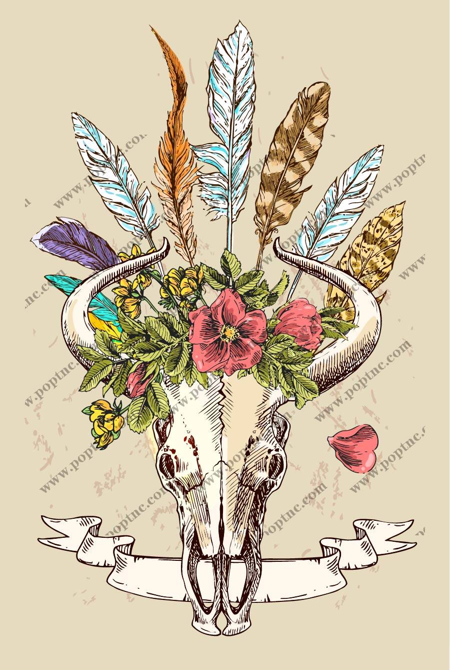 POP花型网 » 几何骷髅头花朵羽毛印花矢量图服装裁片T恤烫图印花花型素材