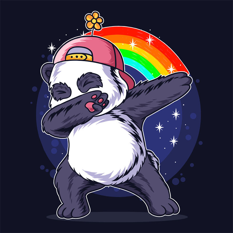 这款创意服装印花设计以可爱的熊猫形象为灵感,搭配粉色帽檐和彩虹元素,适合各种休闲和派对场合。裁片印花工艺让图案更加立体,适合T恤、卫衣等服装款式。