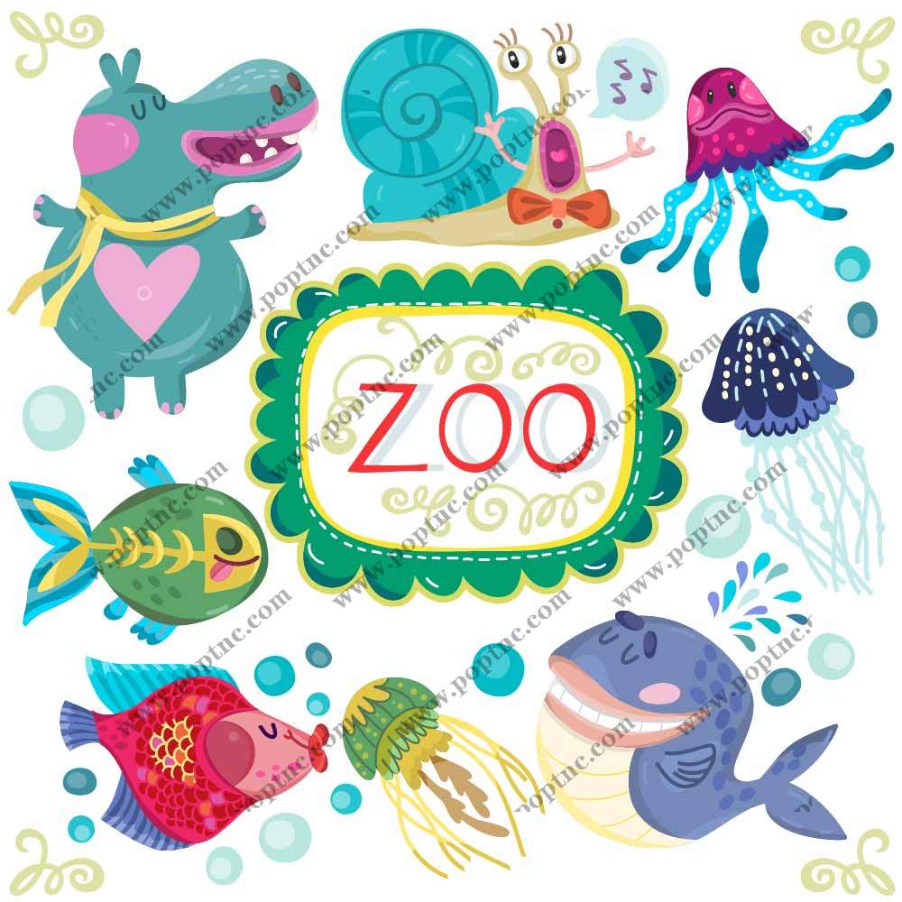 POP花型网 » 卡通动物河马鱼蜗牛字母印花矢量图服装裁片T恤烫图印花花型素材
