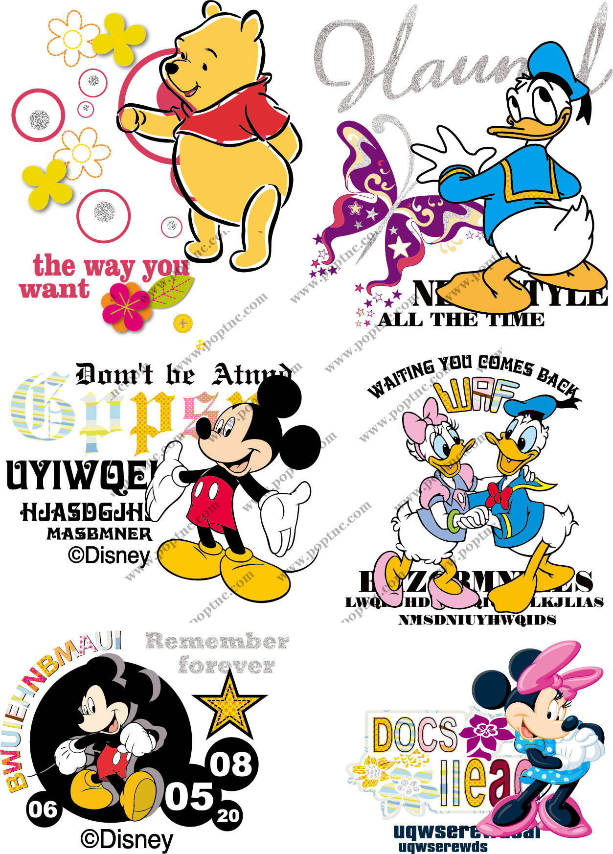 POP花型网 » 卡通动漫唐老鸭维尼熊迪士尼米奇字母印花矢量图服装裁片T恤烫图印花花型素材
