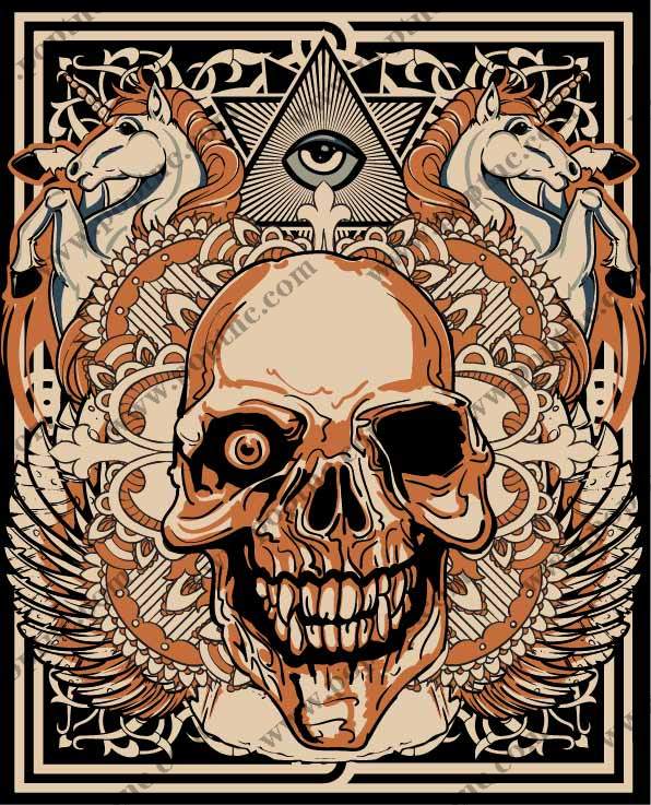 几何条纹独角兽翅膀骷髅头印花矢量图服装裁片T恤烫图印花花型素材